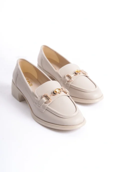 Bej rengi uzun topuklu loafer ayakkabı, 9 cm topuk boyu ve şık tokalı tasarımıyla günlük kullanım için mükemmel bir seçimdir. Hem zarif hem de rahat, her adımda konfor sunar.