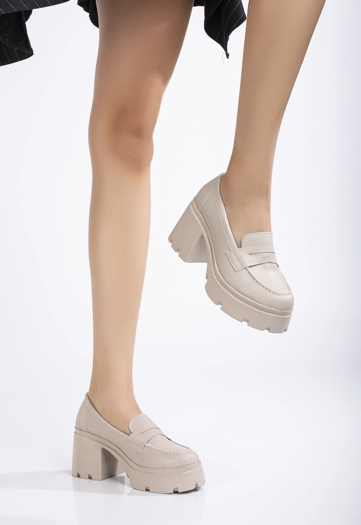 Bej Rengi Uzun Topuklu Loafer – 9 cm Kalın Topuklu Günlük Kadın Ayakkabı