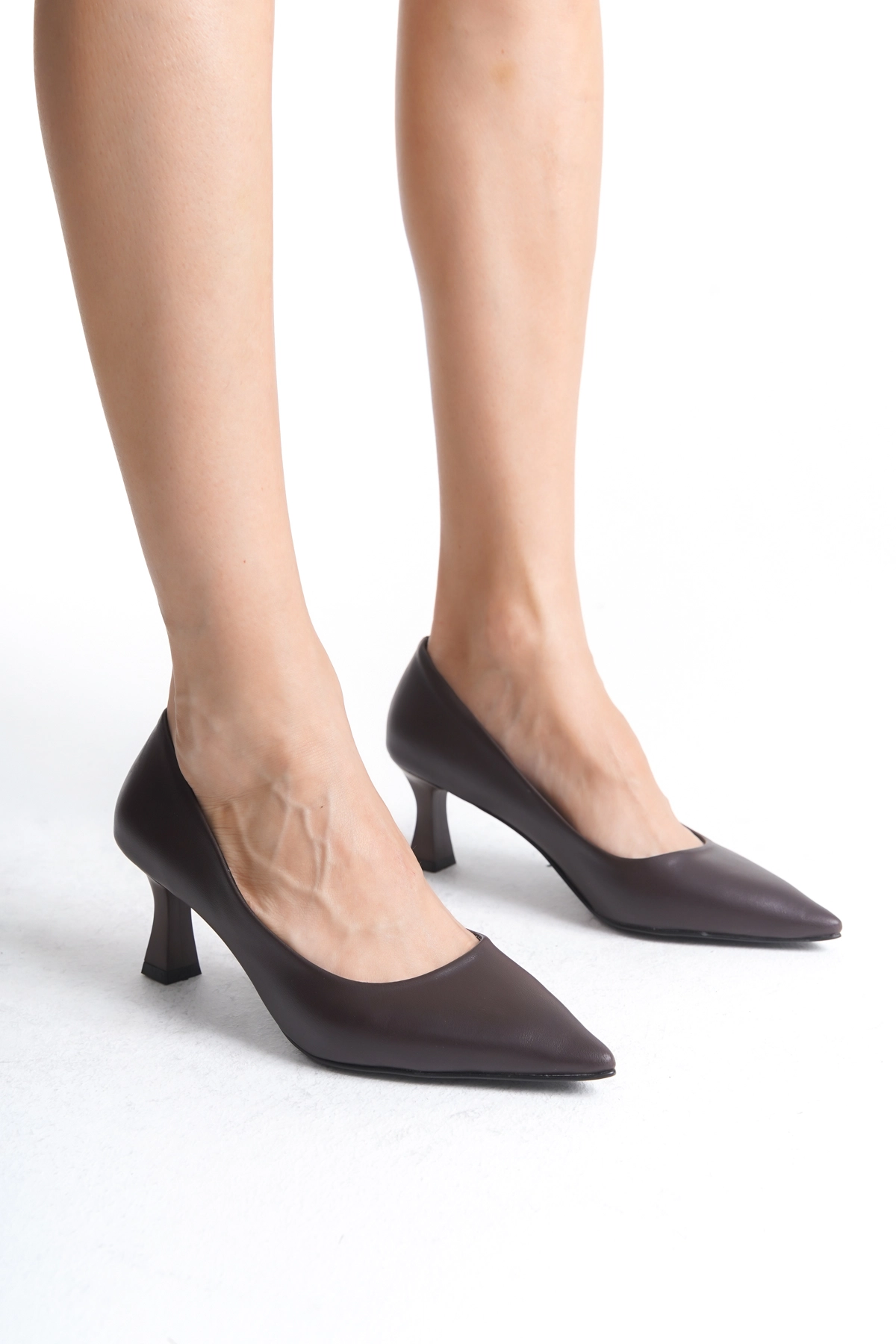 Kahverengi zarafetiyle öne çıkan 6 cm kadeh topuklu stiletto, ortopedik tabanı ve ithal suni derisiyle günlük kullanıma uygun, konforlu bir tercih sunar. Tam kalıp tasarımı her kombini tamamlar.
